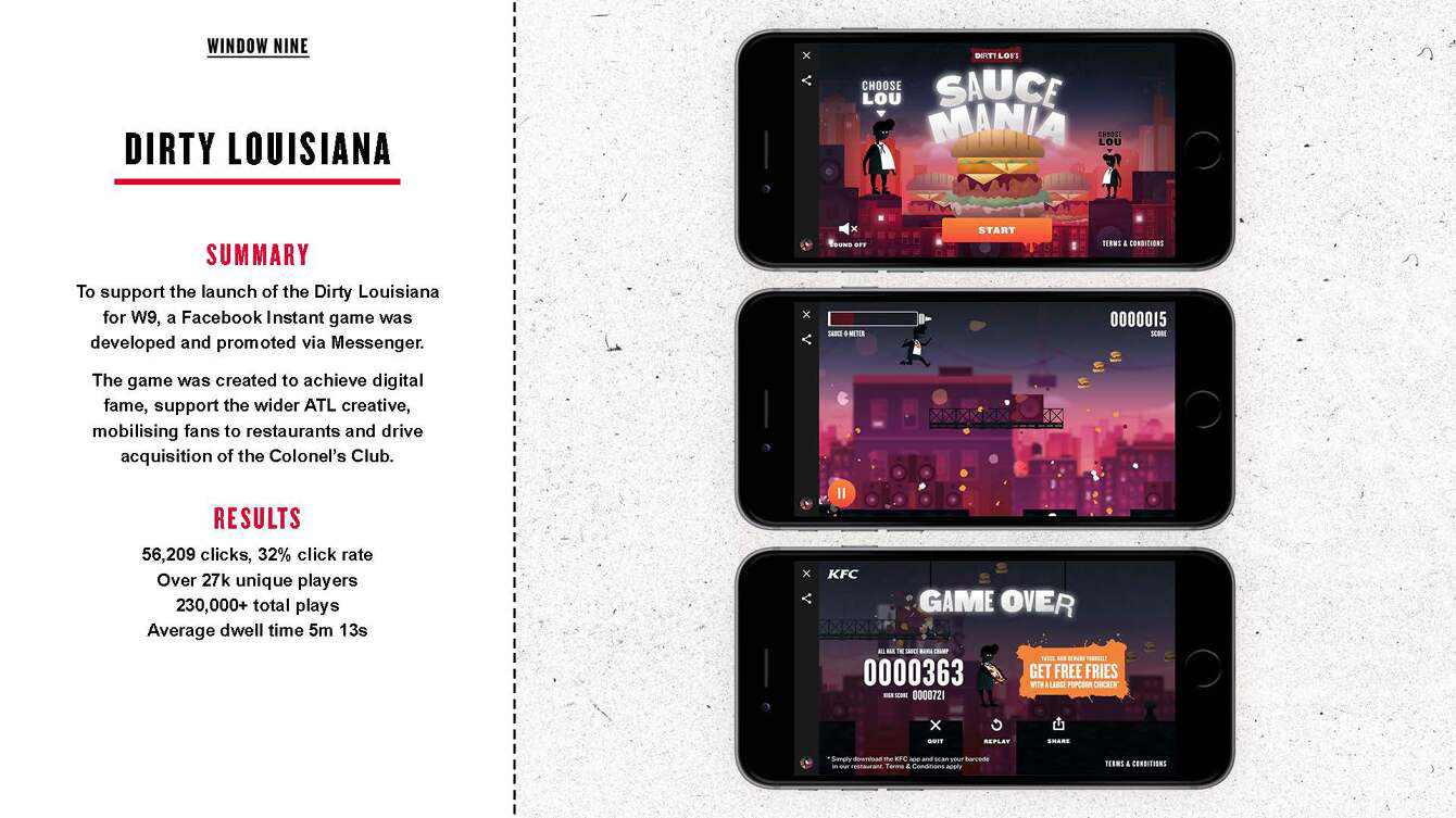 Whether they survived or died a miserable sauce-sodden death every player was a winner. At game end we invited them to download the app and redeem a voucher for the Dirty Louisiana in KFC restaurants.